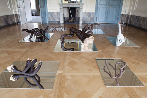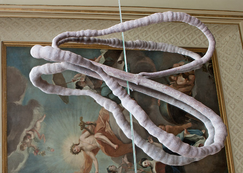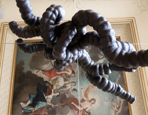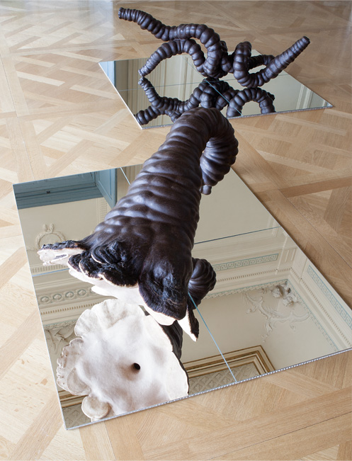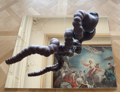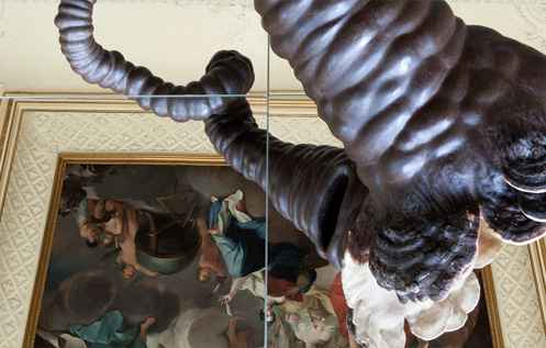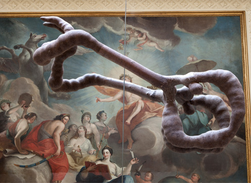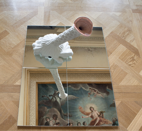Mehrere Spiegelflächen sind auf dem Boden des Saales ausgelegt. Sie stellen auch die unbewegte Wasserfläche der Rossquelle dar, worin sich das Deckengemälde spiegelt. Die Deckenmalerei von Emanuel Handmann liegt nun sozusagen am Boden. Daraus entwachsen verschlungene Objekte. In den Spiegelungen sind die nach unten ausgerichteten Ansichten der Objekte sichtbar. Die Gebilde – oder sind es stilisierte Musikinstrumente, die Attribute der Musen? – verschmelzen in der Verdoppelung mit dem gespiegelten Deckengemälde.
