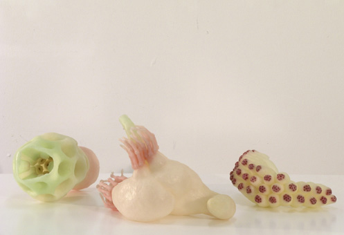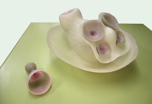 Beim näheren Herantreten erhält der Betrachter, die Betrachterin durch eine Glasplatte Einblick in die Kästen. Es könnten Schaukästen für wissenschaftliches Dokumentations-material sein. Die darin aus Wachs geformten Ausschnitte zeigen zarte Gebilde, die sich neben wächsernen Seiten, aus einem wächsernen Untergrund, den Betrachtenden entgegenrecken, in sich leuchtend.
